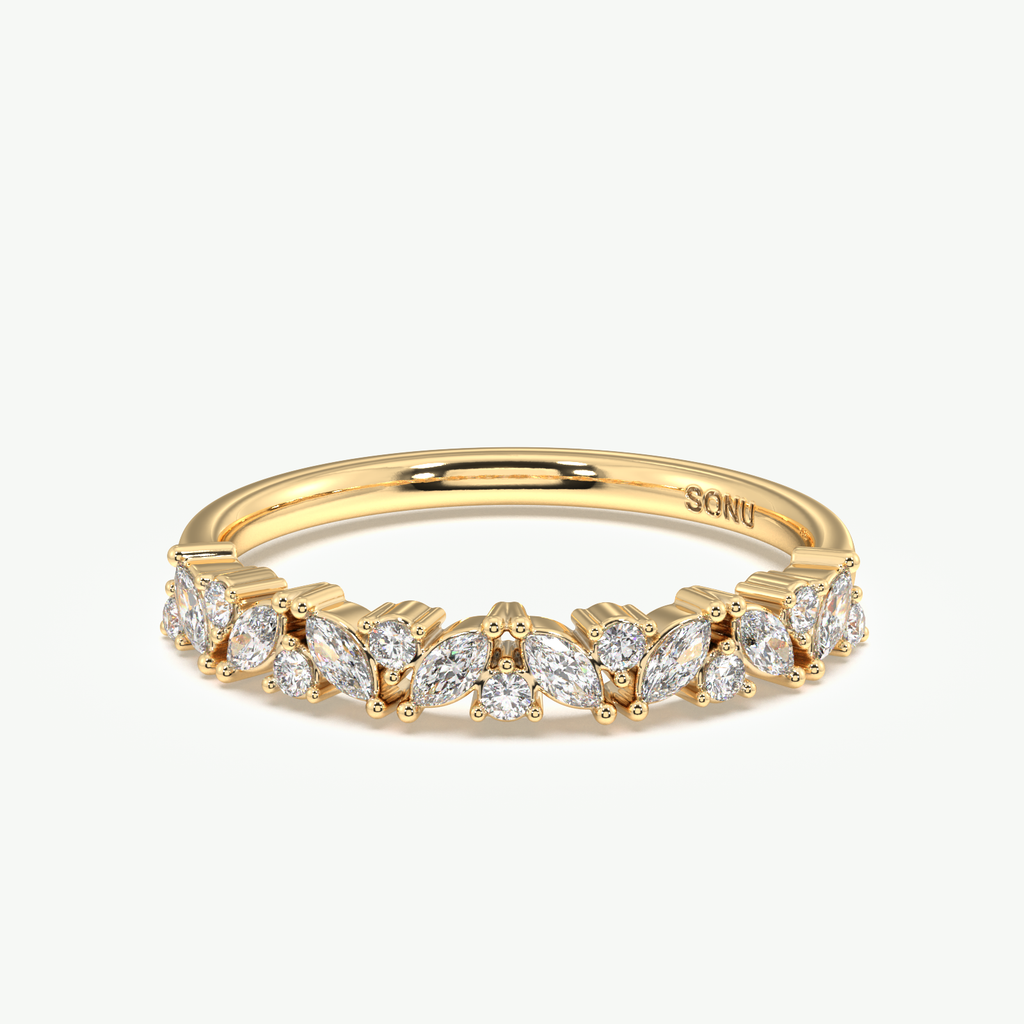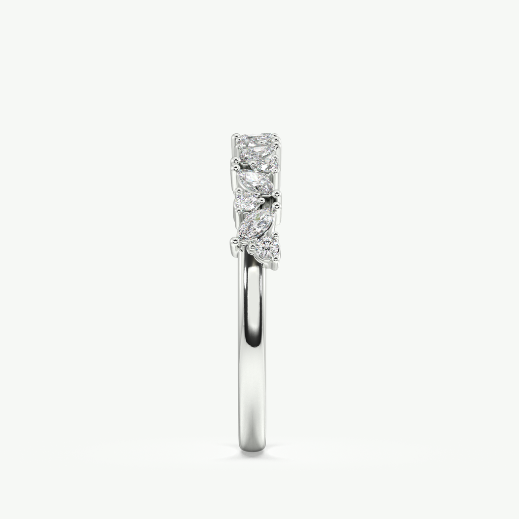Crafted with alternating marquise and round lab grown diamonds, it offers the traditional elegance of a wedding band with a modern twist.